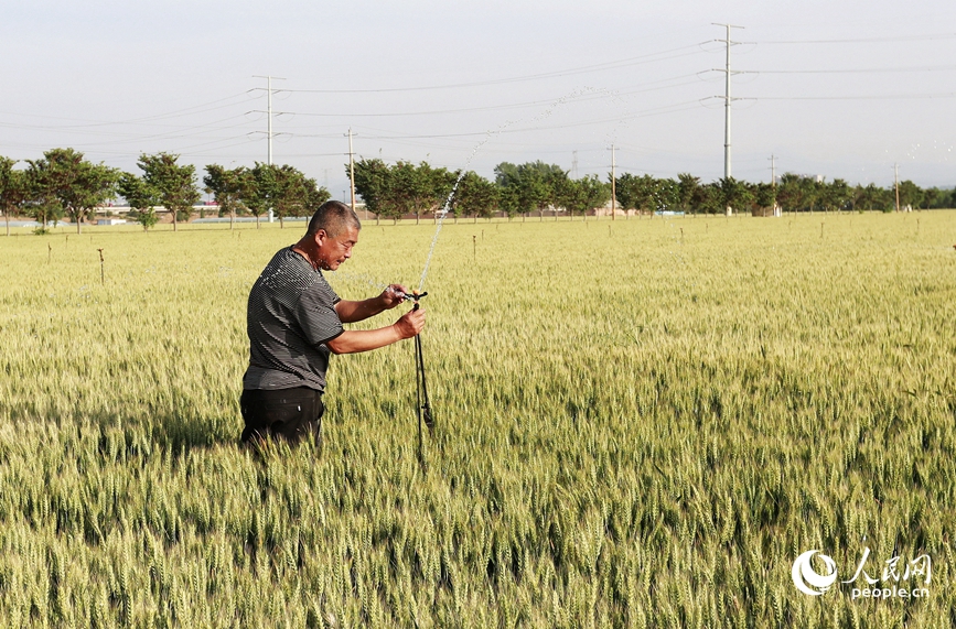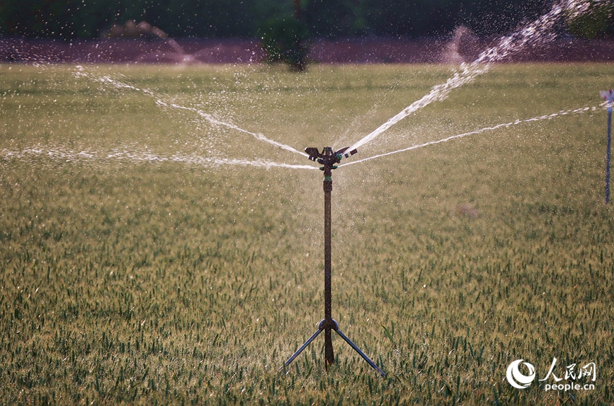“正浇地呢,水管爆了,地里小麦曾经是灌浆中后期了,可不敢洪流漫灌,田里如果积了水,就坏事了。”关掉水泵,王松涛轻踩水管,分段查抄,发觉一处溢水严沉的爆裂点。剪掉破损段,将水管接头和喉箍从头毗连两头,再次推开水闸,一排排灌溉设备恢复功课,洒下一层层绵密的水帘。