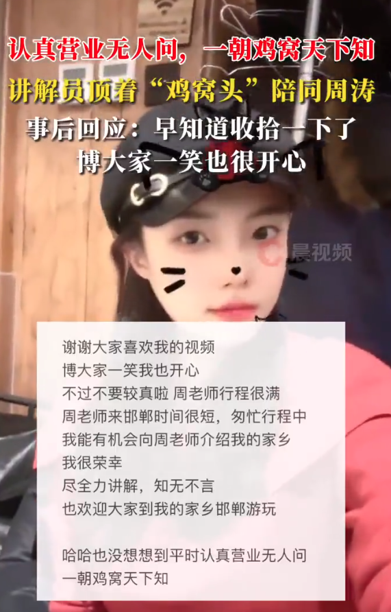 近日,出名掌管人周涛现身邯郸加入勾当,一顶着“鸡窝头”的女孩为其不测走红。1月4日,这名网友更新动态回应:“家一笑我也高兴,不外不要较实啦,我能无机会向周教员引见家乡是我的侥幸。尽全力,各抒己见,也欢送大师到我的家乡邯郸玩耍。哈哈,一朝鸡窝全国知。”!